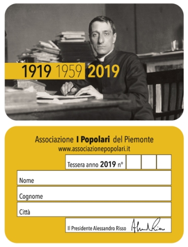 La tessera del 2019 riporta perciò anche le due date delle ricorrenze – 1919 e 1959 – insieme al celebre ritratto fotografico del giovane don Luigi seduto alla sua scrivania.