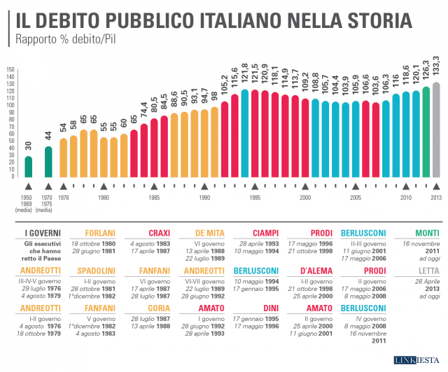Da almeno 35 anni il debito pubblico costituisce lo snodo che condiziona le scelte di politica economica italiane. Da un generico: “questo non si può fare perché l’eccessivo peso del debito pubblico non ce lo permette” a uno specifico: “quell’azione di politica economica – ad esempio, una politica fiscale espansiva, necessaria per far crescere domanda, PIL e occupazione – non è realizzabile perché creerebbe deficit del bilancio pubblico, che farebbe aumentare il debito pubblico, il che è impensabile”…