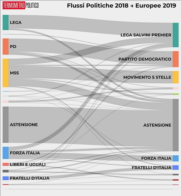 Il PD limita le perdite ma non attrae nuovi elettori. Il Movimento 5 Stelle “traghetta” voti verso la Lega. E il partito di Salvini si dimostra il “pigliatutto” della situazione: conquista voti dall’alleato di governo, dai partiti di centrodestra e (qualche volta) anche dal PD.