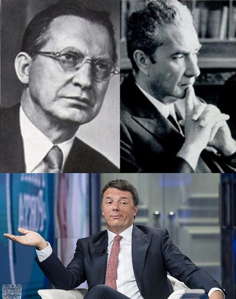 1. Guardiamo al prossimo futuro. E a quanto potrebbe verificarsi al “centro” della politica (con aggregazioni del lego di forze ora disponibile). De Gasperi e Moro ci raccontano di politiche sociali, di equità, di libertà diverse; e non solo rispetto al giovane ex premier, ma anche di altre figure che affollano il “centro” e temo diventino i co-condottieri delle nuove politiche popolari. Il cattolicesimo democratico e sociale deve avere altre prospettive, anche in Europa: le attuali famiglie politiche non rispondono (e non possono rispondere, senza cambiamenti rivoluzionari) a quanto serve oggi alla fase di Nuovo Umanesimo, di Democrazia Comunitaria, di Pluralismo Solidale